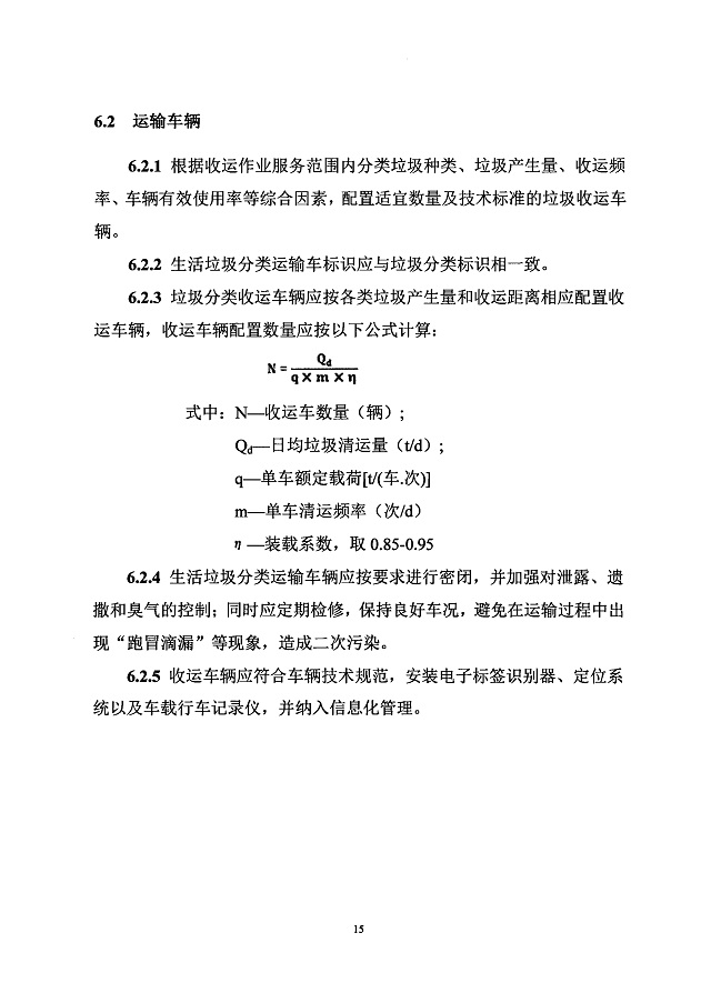 6.1.1根據(jù)城市確定的生活垃圾分類類別實行分類運輸,分別配置適 宜數(shù)量的有害垃圾、廚余垃圾、可回收物、其他垃圾的分類運輸車輛,以 及垃圾大分流所需要的大件垃圾、餐廚廢棄物等分類運輸車輛。