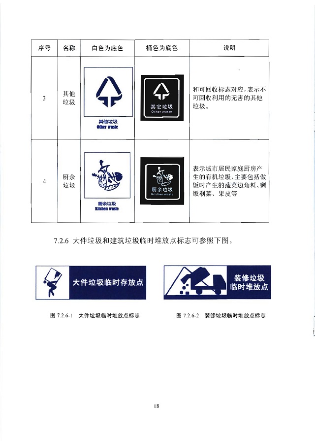 4.1.6新建小區(qū)和有條件的既有小區(qū)宜在合適區(qū)域設(shè)置裝修垃圾、大 件垃圾、綠化垃圾等收集點,收集點應(yīng)建有層G不低于3米封閉構(gòu)筑物, 并設(shè)置明顯標(biāo)志,面積不小于30平方米。進出通道應(yīng)滿足車輛G度、寬度 等通行條件;大件垃圾收集點宜結(jié)合裝修垃圾收集點合并設(shè)置。既有小區(qū) 應(yīng)根據(jù)實際情況,指定裝修垃圾、大件垃圾、綠化垃圾等臨時分類堆放場 所,并設(shè)置明顯標(biāo)志。