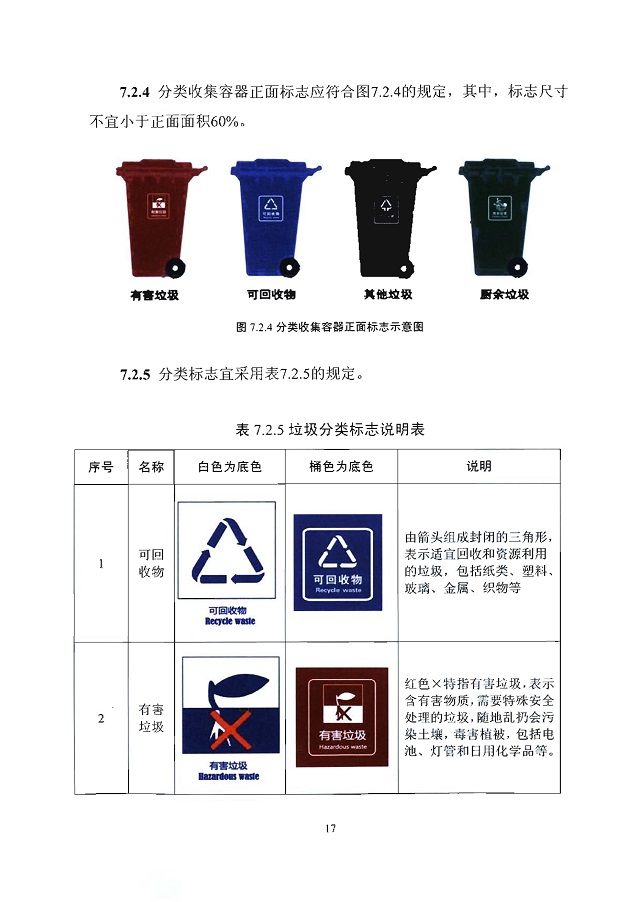 4.1.1實施“四分類”的小區(qū),應(yīng)配置規(guī)范的有害垃圾、廚余垃圾、 可回收物、其他垃圾四婁收集容器。實施“三分類”的居住小區(qū),應(yīng)配置 規(guī)范的有害垃圾、可回收物、其他垃圾三類收集容器。