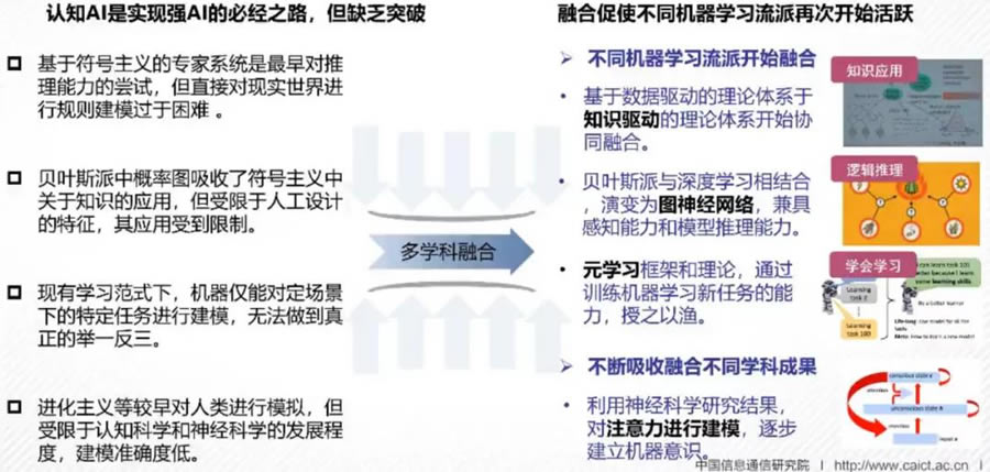 雖然AI已經(jīng)廣泛用于日常生活中,但當(dāng)前仍然處于弱AI階段,強(qiáng)AI“道艱且長(zhǎng)”。認(rèn)知AI是實(shí)現(xiàn)強(qiáng)AI的必經(jīng)之路,但缺乏突破,融合不同機(jī)器學(xué)習(xí)流派開始活躍。