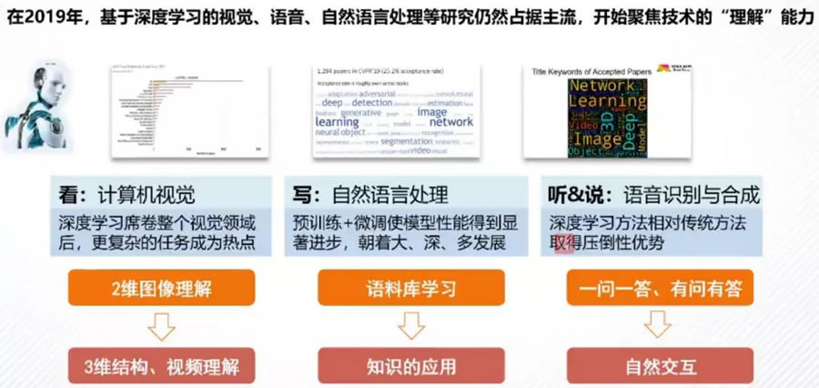 在2019年,基于深度學(xué)習(xí)的視覺(jué)、語(yǔ)音、自然語(yǔ)言處理等研究仍占據(jù)主流,人們開始聚焦技術(shù)的“理解”。