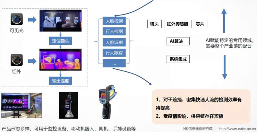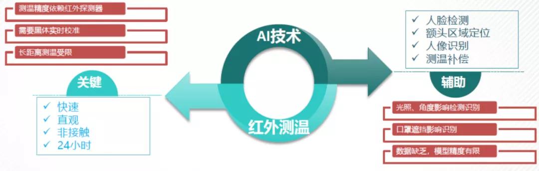 AI體溫檢測的關(guān)鍵在于紅外體溫。測溫精度不足,僅可對人員進(jìn)行初篩;受環(huán)境因素影響較大,遠(yuǎn)距離測溫?zé)o法解決;測溫精度修正成為AI未來的突破重點(diǎn);相關(guān)技術(shù)和產(chǎn)品亟需制定標(biāo)準(zhǔn)規(guī)范。AI技術(shù)在復(fù)雜環(huán)境下的遠(yuǎn)距離紅外測溫方向上仍需深耕。