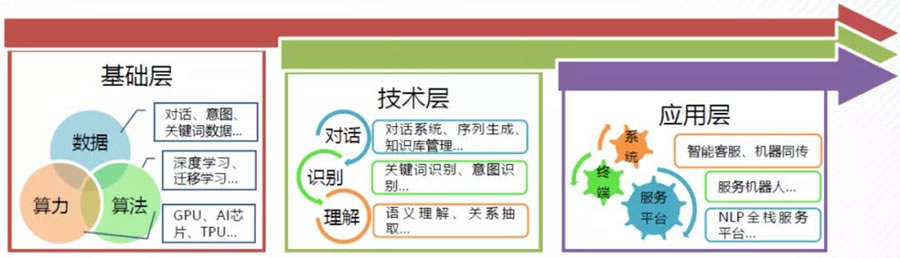 AI+NLP,具備認(rèn)知能力方能更懂用戶所言所想,層J劃分如圖18所示。國內(nèi)總體呈現(xiàn)出重應(yīng)用/輕創(chuàng)新的問題,AI+NLP“基礎(chǔ)建設(shè)”設(shè)施不全。優(yōu)劣勢明顯。優(yōu)勢有:1)技術(shù)鏈齊備:在基礎(chǔ)層/技術(shù)層/應(yīng)用層上均有所布局;2)中文NLP技術(shù):技術(shù)多面,對話系統(tǒng)、關(guān)鍵詞識(shí)別、語義理解效果提升明顯;3)數(shù)據(jù)資源豐富:收益于龐大的用戶群,可通過社交媒體收集相關(guān)文本、對話、翻譯數(shù)據(jù)。劣勢有:1)AI基礎(chǔ)層技術(shù)儲(chǔ)備不足;2)G度依賴國外計(jì)算硬件,GPU、AI芯片等;3)模型算法自主研發(fā)能力欠缺,G度依賴國外開源技術(shù);4)數(shù)據(jù)標(biāo)注和技術(shù)評價(jià)缺少統(tǒng)一的標(biāo)準(zhǔn)和規(guī)范。