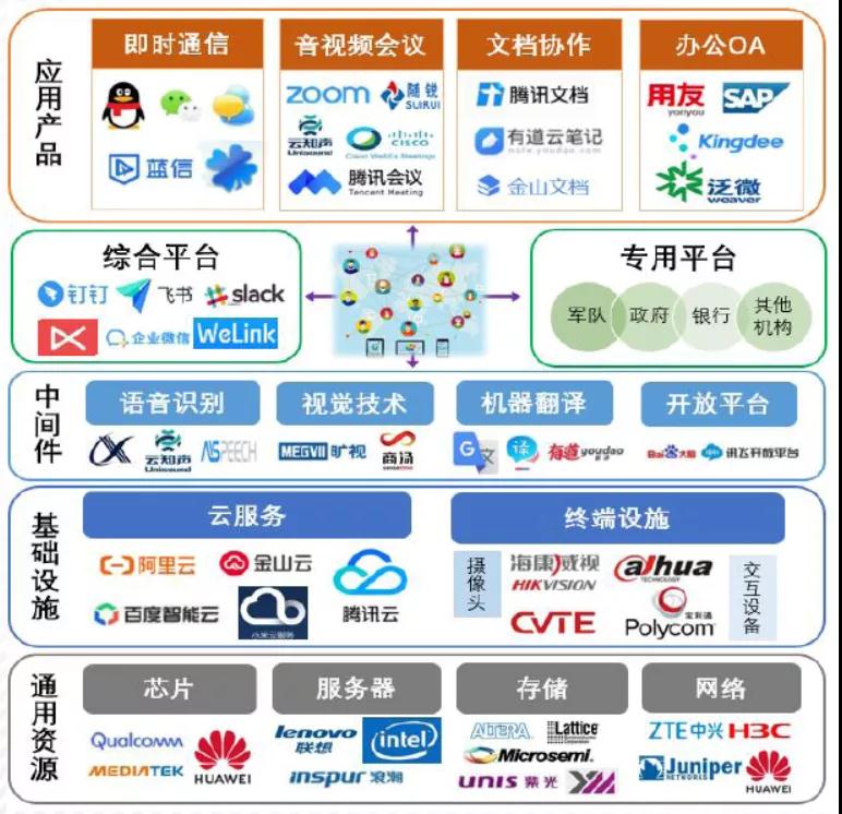 國內(nèi)在線辦公起步較晚,但發(fā)展迅速且產(chǎn)業(yè)鏈條完整,如圖23所示。國外在線辦公軟件起步較早,用戶付費(fèi)意愿較G。受到疫情影響,國內(nèi)在線辦公受到熱捧,有望培養(yǎng)用戶習(xí)慣,并形成可持續(xù)的商業(yè)模式。據(jù)國外機(jī)構(gòu)Apps Run The World數(shù)據(jù),2018年排名前10位的協(xié)作軟件供應(yīng)商占協(xié)作整體市場的55.7%,其中微軟以占L20.8%的市場份額L跑市場,其次是思科、谷歌、LogMein和Slack。我國協(xié)同辦公市場規(guī)模也呈逐年擴(kuò)大趨勢,據(jù)不完全統(tǒng)計(jì),國內(nèi)提供協(xié)同辦公產(chǎn)品的企業(yè)約有500余家,2019年產(chǎn)業(yè)規(guī)模達(dá)到459.5億元。即時(shí)通訊:國內(nèi)互聯(lián)網(wǎng)公司技術(shù)和市場成熟;微信、釘釘、飛書、藍(lán)信等處于L先地位。音視頻會(huì)議:Zoom和思科Webex占據(jù)龍頭地位;國內(nèi)飛書、釘釘?shù)燃闪藭?huì)議功能,也有專注視頻會(huì)議的隨銳、全視通等。文檔協(xié)同:微軟憑借office軟件在占據(jù)著先發(fā)優(yōu)勢;金山得益于WPS office 的深耕,市場占有率逐步提G。辦公OA:國內(nèi)辦公OA歷史較長,主要企業(yè)包括用友、SAP、金蝶、金和、致遠(yuǎn)互聯(lián)、泛微等。適應(yīng)國內(nèi)習(xí)慣和需求,本土企業(yè)優(yōu)勢明顯。