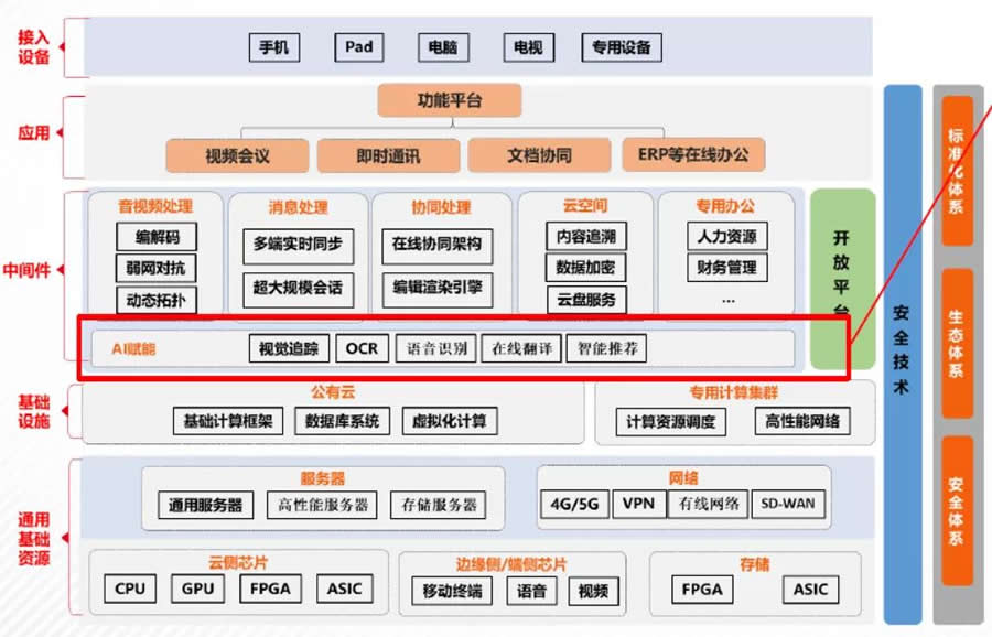 AI賦能協(xié)同辦公系統(tǒng),如圖22所示,提升辦公軟件性能。AI技術(shù)主要是讓在線辦公系統(tǒng)更加智能,提供更出色的用戶體驗(yàn)。網(wǎng)絡(luò)質(zhì)量預(yù)測。用于動(dòng)態(tài)調(diào)整網(wǎng)絡(luò)拓?fù)、編碼方式等,保證通信質(zhì)量。人臉識(shí)別技術(shù)驗(yàn)證身份,提升會(huì)議系統(tǒng)的安全性。對視頻質(zhì)量進(jìn)行動(dòng)態(tài)改善,提升交流體驗(yàn)。利用語音識(shí)別和翻譯技術(shù),實(shí)現(xiàn)會(huì)議字幕生成和翻譯。AI在協(xié)同辦公軟件中可發(fā)揮的作用有待進(jìn)一步挖掘。