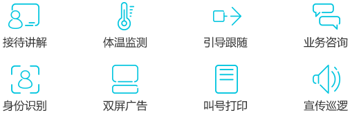 32寸主屏搭載可定制化模塊,提供迎賓接待、業(yè)務(wù)咨詢、體溫監(jiān)測(cè)等特色服務(wù)的智能大屏機(jī)器人?蓪(shí)現(xiàn)接待講解、引導(dǎo)跟隨、宣傳巡邏等功能,還可提供人臉識(shí)別、二維碼掃描、身份證讀取、叫號(hào)、打印等特色服務(wù)。