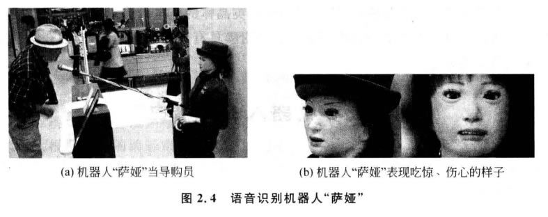 日本著名的東京高島屋商場為了解決顧客排長隊購物難的問題,引入了一款語音識 別機(jī)器人“薩婭”當(dāng)導(dǎo)購員,如圖2.4所示。“薩婭”能夠用超過700種不同的語音方式對 購物者的問題和投訴做出反應(yīng),它會告訴顧客去哪層樓能夠買到他們所需的商品,還能 和他們閑聊幾句,但是有時也會無法“溝通”。曾有一位記者問“薩婭”問題,可能是因?yàn)? 他口音太重,“薩婭”聽不懂,一直指著洗手間的方向,無法告訴記者所要去的商場樓層。 雖然“薩婭”的面部動作還存在一些不足,但是它表現(xiàn)高興、傷心或生氣時是很逼真的。 盡管“薩婭”是一個語音識別服務(wù)機(jī)器人,但是它像其他日本人那樣講禮貌,彬彬有禮。