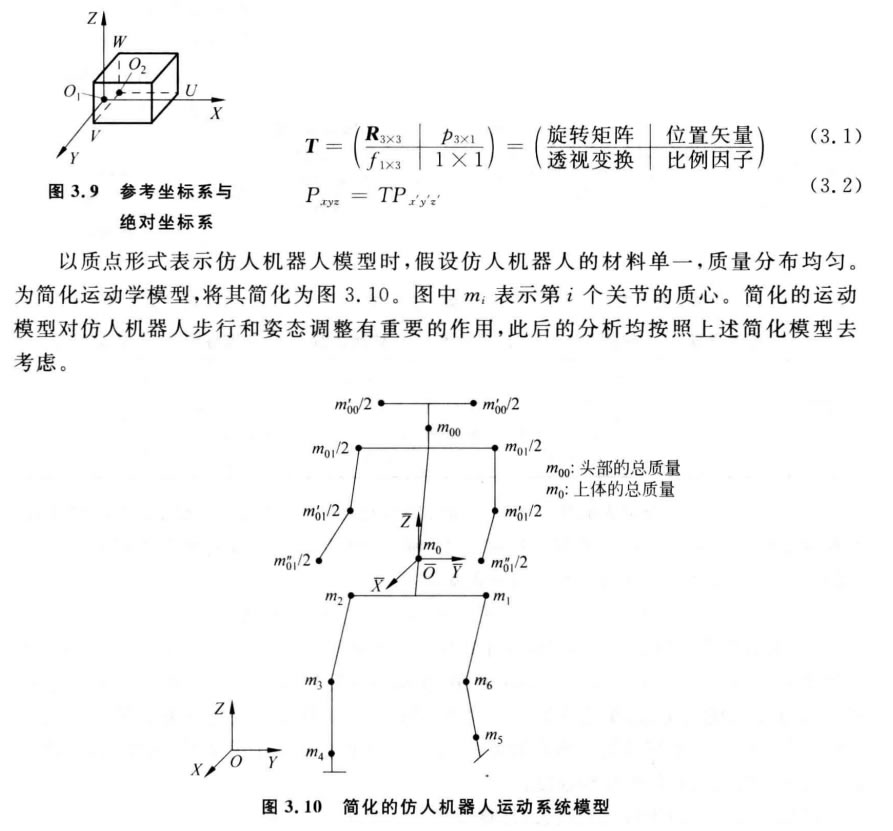 智能接待仿人機(jī)器人除了具有腿部的行走功能外,還具有上身的功能,自由度也比雙足機(jī)器 人成倍的增加。從仿生角度看,人的手臂在運動中起著協(xié)調(diào)運動的作用,智能接待仿人機(jī)器人的手 臂是d立運動的,在行走運動過程中起著重要的調(diào)整作用。從運動鏈角度看,智能接待仿人機(jī)器人由于有手臂運動,故它是由三條鏈組成的復(fù)合運動鏈,運動學(xué)、動力學(xué)、運動規(guī)劃上更為復(fù) 雜,不能直接用雙足機(jī)器人的動力學(xué)模型來描述[94]。本節(jié)將在雙足機(jī)器人模型的基礎(chǔ)上, 結(jié)合智能接待仿人機(jī)器人的運動特點,建立一個合適的運動模型,導(dǎo)出步行運動的數(shù)學(xué)描述。 本節(jié)設(shè)計的是一個19 DOF 的智能接待仿人機(jī)器人,暫不考慮其頭部 和手指的自由度。