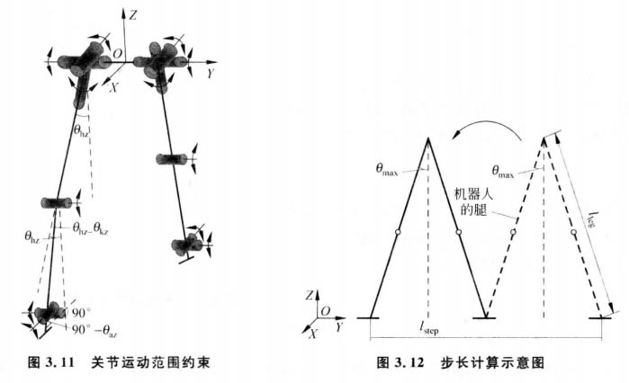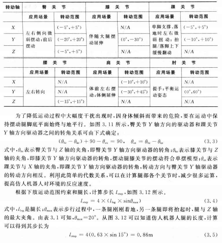 (1)運(yùn)動(dòng)范圍約束。智能接待智能接待機(jī)器人各個(gè)關(guān)節(jié)都有其運(yùn)動(dòng)范圍,需要對(duì)各個(gè)關(guān)節(jié)的運(yùn)動(dòng) 范圍進(jìn)行約束。為了使其能夠更穩(wěn)定地步行,要分別對(duì)智能接待智能接待機(jī)器人下肢12 DOF 的運(yùn)動(dòng) 和上體腰及手臂等7個(gè)關(guān)節(jié)的運(yùn)動(dòng)進(jìn)行約束。全身各個(gè)關(guān)節(jié)的運(yùn)動(dòng)范圍分別如表3.1 所示,由于兩條腿的運(yùn)動(dòng)范圍一樣,所以表3.1中沒有區(qū)分左右腿,只是按照關(guān)節(jié)來描 述。運(yùn)動(dòng)幅度正負(fù)的標(biāo)定是以直立姿態(tài)為標(biāo)準(zhǔn),根據(jù)關(guān)節(jié)轉(zhuǎn)動(dòng)方向來定,順時(shí)針方向?yàn)?負(fù),逆時(shí)針方向?yàn)檎?