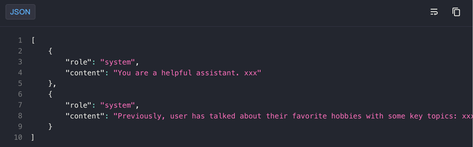 以下示例展示了通過(guò) system_messages 注入經(jīng)過(guò)總結(jié)的記憶內(nèi)容: