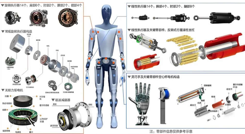 電機(jī)與減速器是構(gòu)成機(jī)器人關(guān)節(jié)驅(qū)動(dòng)系統(tǒng)的核心機(jī)電組件,包括無(wú)框力矩電機(jī)、 RV 減速器和諧波減速器等。該模塊通過(guò)將電能高效轉(zhuǎn)化為高精度機(jī)械運(yùn)動(dòng),為機(jī)器人關(guān)節(jié)提供穩(wěn)定、靈活且高響應(yīng)的動(dòng)力支持,支撐行走 、抓取等復(fù)雜動(dòng)態(tài)行為。