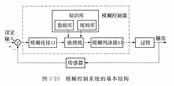 模糊控制系統(tǒng)的基本結(jié)構(gòu)如圖5-23所示。其中,模糊控制器由模糊化接口、知識庫、 推理機和模糊判決接口4個基本單元組成。