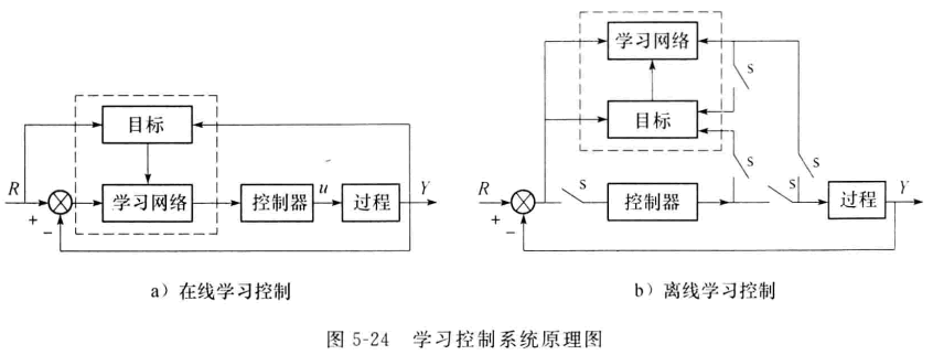 學(xué)習(xí)控制具有4個(gè)主要功能:搜索、識(shí)別、記憶和推理。在學(xué)習(xí)控制系統(tǒng)的研制初 期,對(duì)搜索和識(shí)別的研究較多,而對(duì)記憶和推理的研究比較薄弱。學(xué)習(xí)控制系統(tǒng)分為兩 類,即在線學(xué)習(xí)控制系統(tǒng)和離線學(xué)習(xí)控制系統(tǒng),分別如圖5-24a 和圖5-24b 所示。圖中, R 代表參考輸入;Y 為輸出響應(yīng);u 為控制作用;s 為轉(zhuǎn)換開關(guān)。當(dāng)開關(guān)接通時(shí),該系統(tǒng) 處于離線學(xué)習(xí)狀態(tài)。