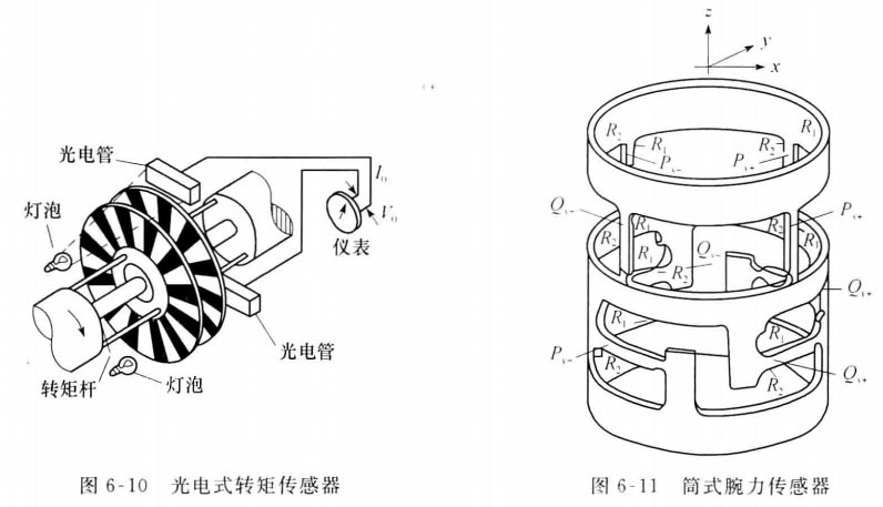 作為例子,國際斯坦福研究所(SRI) 設(shè)計的手腕力覺傳感器如圖6- 11所示。它由六個 小型差動變壓器組成,能測量作用于腕部x 、y 和 z 三個方向的力及各軸的轉(zhuǎn)矩。
