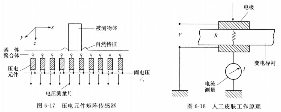 這種傳感器的壓敏元件是埋放在彈性聚合體內(nèi),見圖6-17。測量輸出電壓V, 就能夠獲得物體作用力形成的映像 。