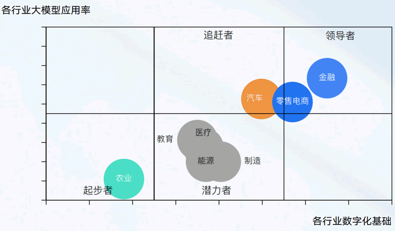 但另一組數(shù)據(jù)更值得玩味:金融、零售電商、汽車三大行業(yè),已悄然躍入"領(lǐng)導(dǎo)者"象限,其大模型應(yīng)用率與數(shù)字化基礎(chǔ)呈現(xiàn)強(qiáng)正相關(guān)。而農(nóng)業(yè)、教育、能源等行業(yè),仍在"起步者"與"潛力者"區(qū)間徘徊。